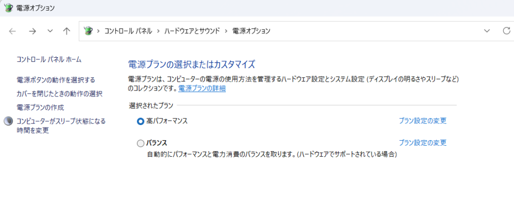図3:電源オプション画面(高パフォーマンスが選択されている状態)